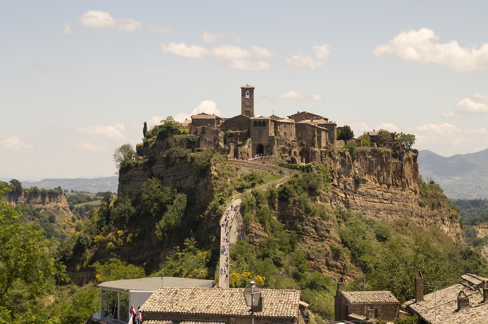 Un tempo Civita e Bagnoregio erano due diversi abitati collegati da un lembo di terra ormai scomparso; oggi, per raggiungere Bagnoregio – che si erge solitaria sulla sommità di uno sperone di roccia nel mezzo di un canyon – esiste solo una possibilità: un ponte artificiale che parte da Civita, percorribile solo a piedi o con mezzi speciali.