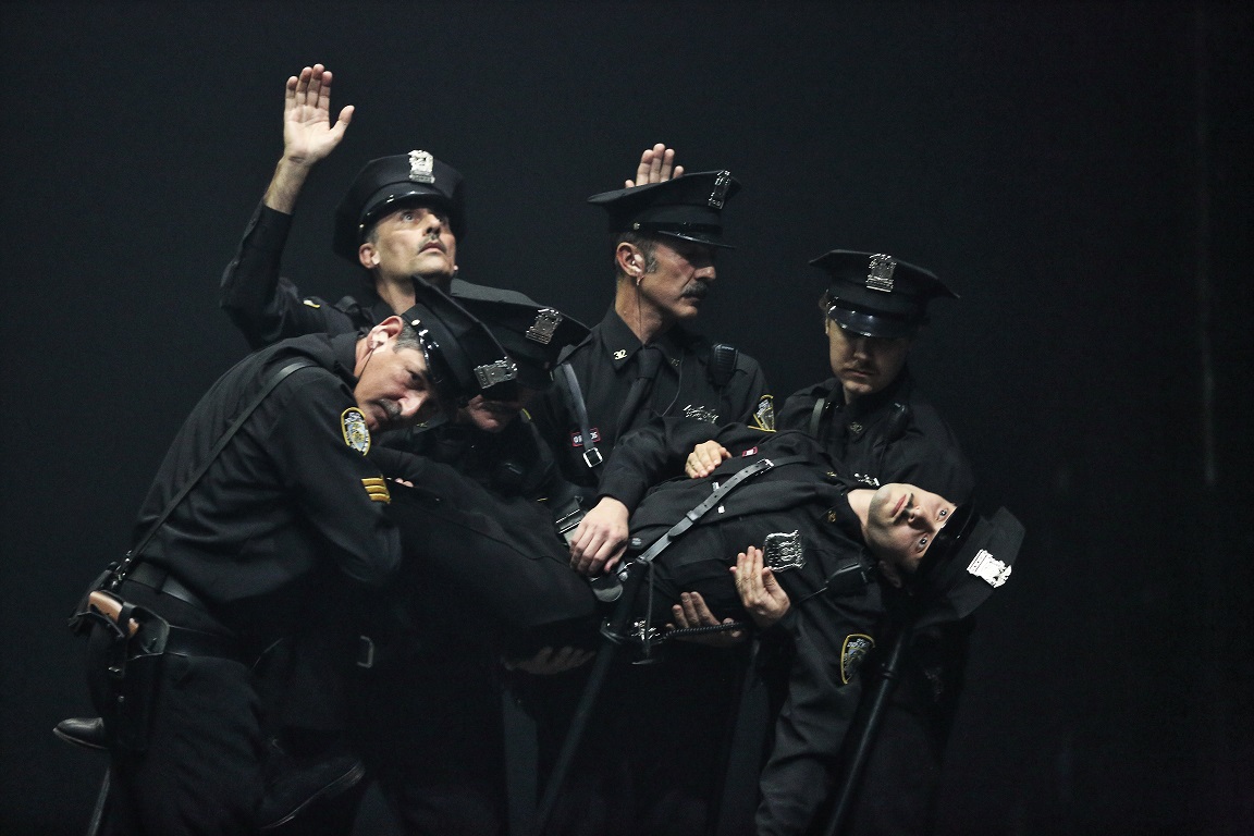 Vestiti da poliziotti e comandati da un auricolare agiscono senza sapere il perché. I protagonisti di ‘Bros’ di Romeo Castellucci, autore di fama internazionale, non sono attori professionisti. Gli stessi vengono reclutati per andare in scena ignari della loro parte. Il loro unico compito è quello di eseguire gli “ordini” che ricevono tramite un auricolare, senza pensare.