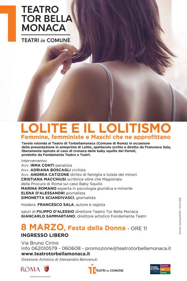 Aspettando questo nuovo, inedito spettacolo scritto e diretto da Francesco Sala, "LOLITE" (al Teatro Belli di Roma dal 13 al 25 febbraio) ispirato al caso delle baby-squillo dei Parioli, nella giornata della Festa della Donna una nutrita tavola rotonda, moderata dallo stesso Sala, vi attende al Teatro di Tor Bella Monaca.